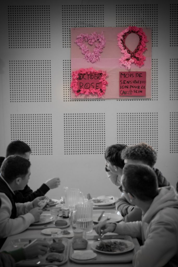 Nos 3ème se sont investis en décorant leur foyer afin de mettre un point d’honneur dans leur lieu de vie pour cette cause. Nos 1ère et 2nde Bac Pro Agroéquipement se sont aussi mobilisés en lien avec leur cour d’art pour réalisés de splendides pancartes Octobre Rose. Par la suite, nos 2nde ont installés sur les bottes enrubannées ces pancartes et également dans le self.